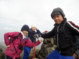| 山頂近くから登ってきた道を見たとき、荒涼たる風景です。 | 山頂にて各自ポーズを。 | |||||||||||||||