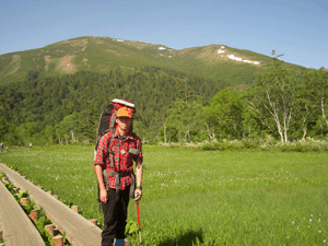 | 山の鼻から尾瀬ヶ原に入ったところ、至仏山をバックに。 | これから行く燧ヶ岳がはるかかなたに見える。 | ||||||||||||||||