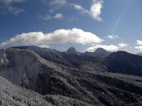 | 雪にうもれた黒百合ヒュッテです。 | 中山峠から見た東天狗岳(左) と西天狗岳、風が強そう。 | |||||||||||||